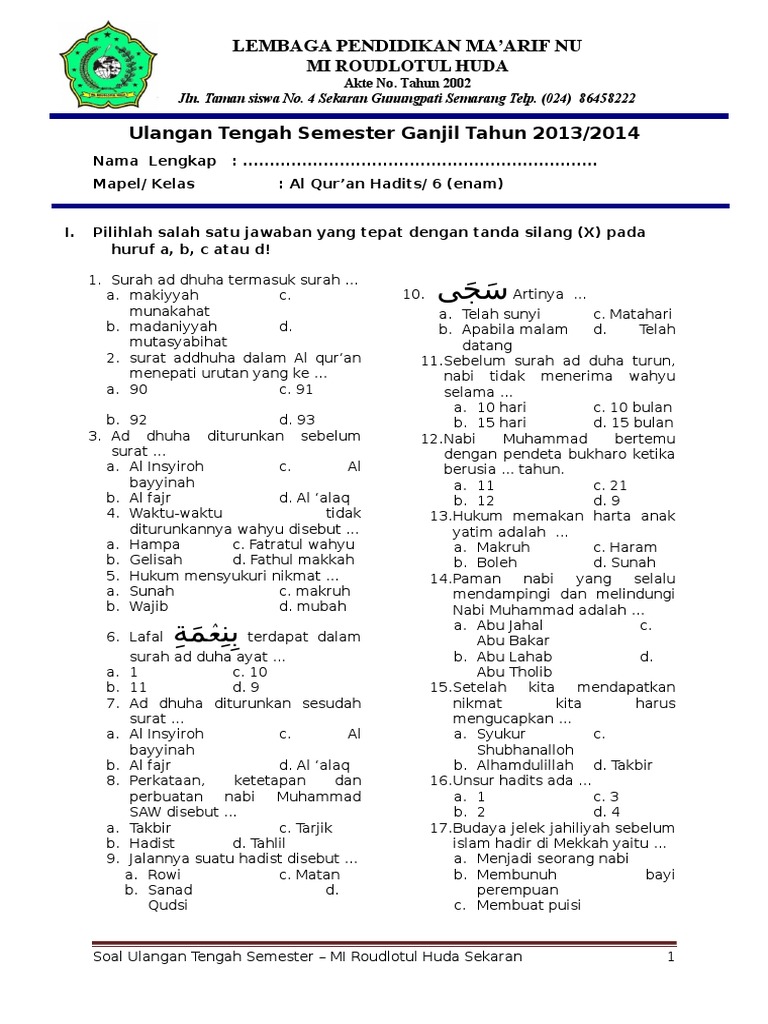 Mungkin ini juga anda butuhkan: Lengkap contoh soal uts qurdits kelas 2 sd mi semester genap tahun. Kumpulan soal ukk qur an hadits sd mi semester 2 genap lengkap. Download soal quran hadits kelas 3 iii semester 1 ini admin akses guru bagikan sebagai sebuah referensi bagi anda dalam melaksanakan berbagai kegiatan ulangan seperti harian uts dan uas yang tentunya dalam pembuatan soal bapak dan ibu membutuhkan sebuah contoh. By kanjeng mariyadi ngawi february 10, 2020.
